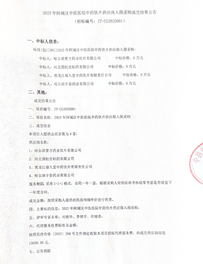 【哈尔滨市阿城区中医医院】黑龙江省哈尔滨市2025年阿城区中医医院中药饮片供应商入围采购成交结果公告