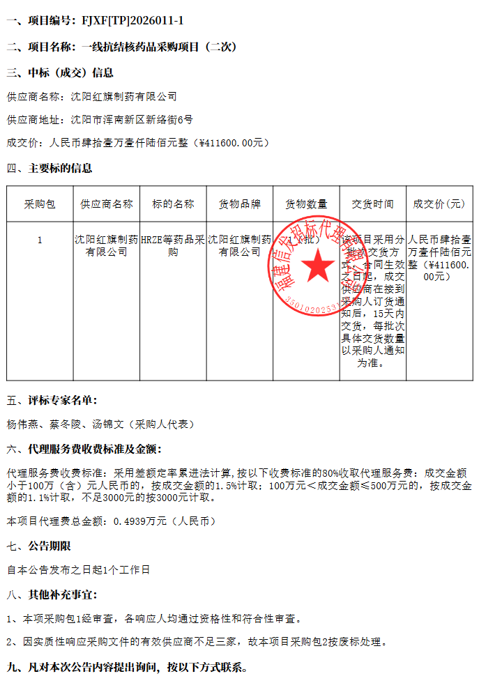 【漳州市疾病预防控制中心】福建省漳州市疾病预防控制中心一线抗结核药品采购项目(二次)成交公告