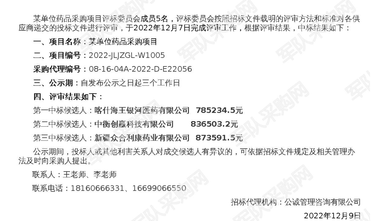 【军队采购】军队采购网药品采购项目中标结果公示 (2022-JLJZGL-W1005)