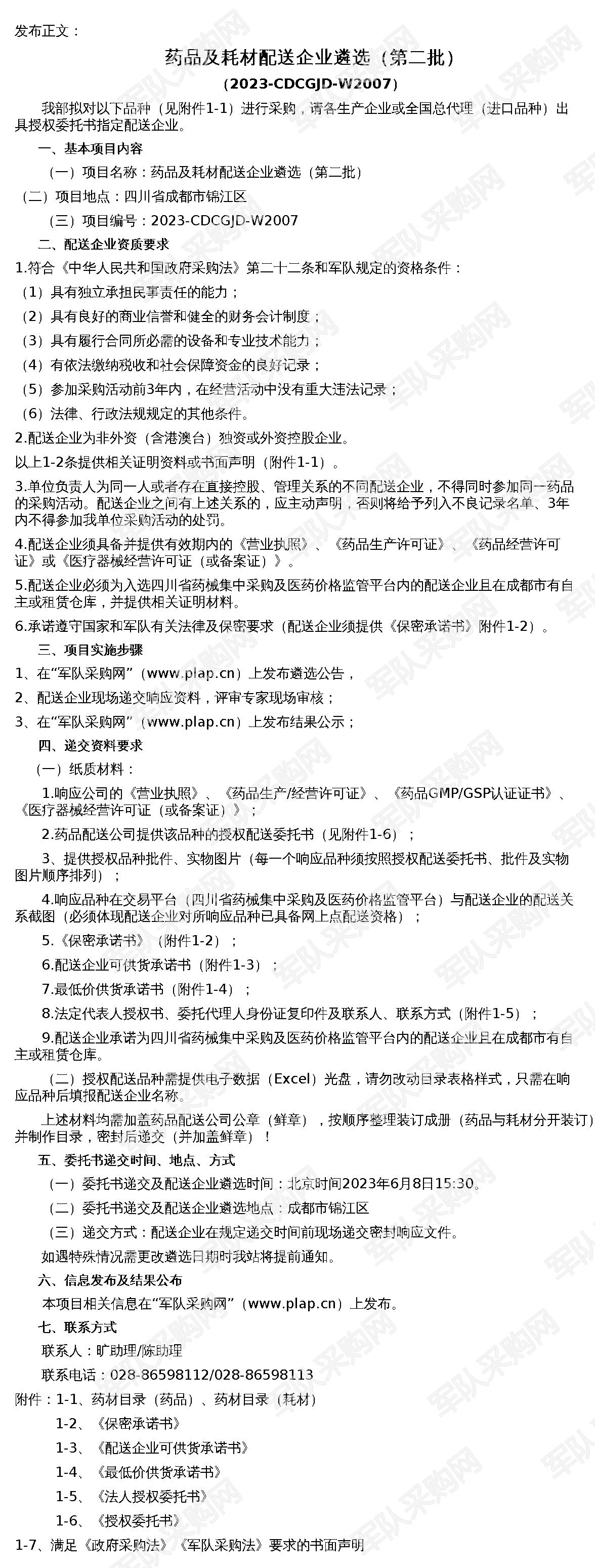【军队采购】军队采购网药品及耗材配送企业遴选(第二批)(2023-CDCGJD-W2007)