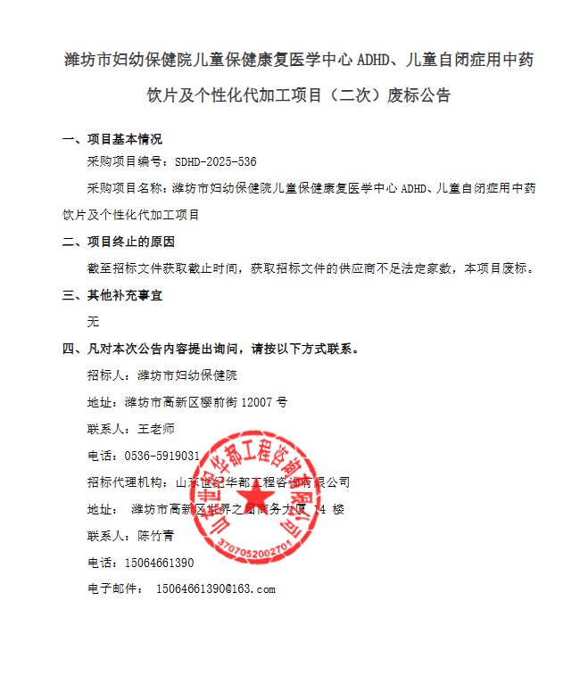 【潍坊市妇幼保健院】山东省潍坊市妇幼保健院儿童保健康复医学中心ADHD、儿童自闭症用中药饮片及个性化代加工项目(二次)废标公告