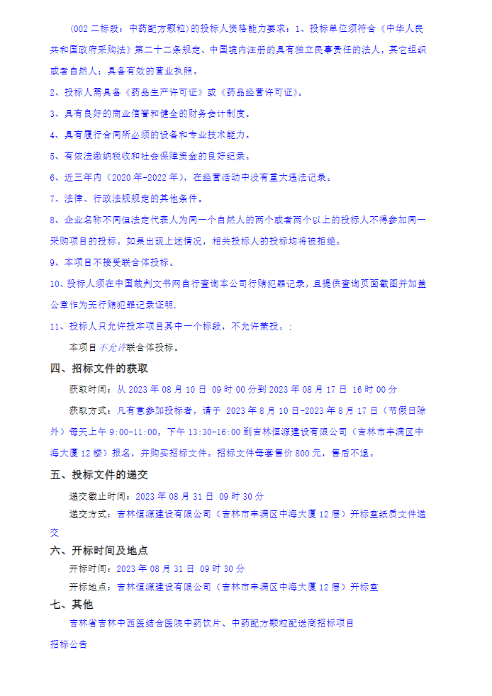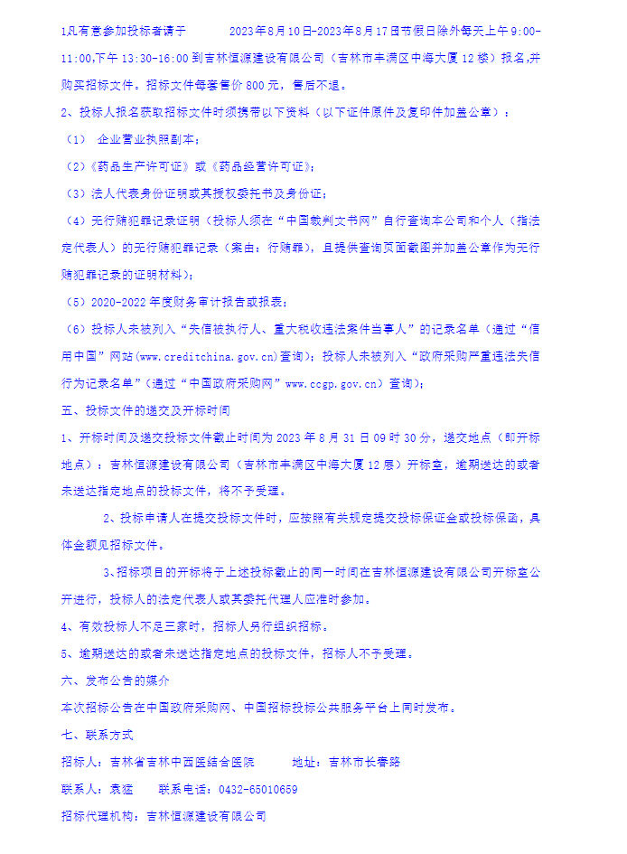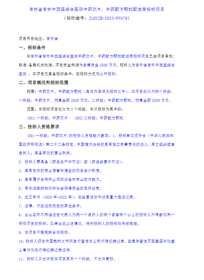 【吉林中西医结合医院】吉林省吉林中西医结合医院中药饮片、中药配方颗粒配送商招标项目