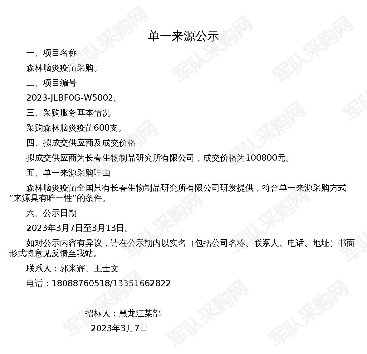 【军队采购】军队采购网采购森林脑炎疫苗单一来源公示(2023-JLBF0G-W5002)