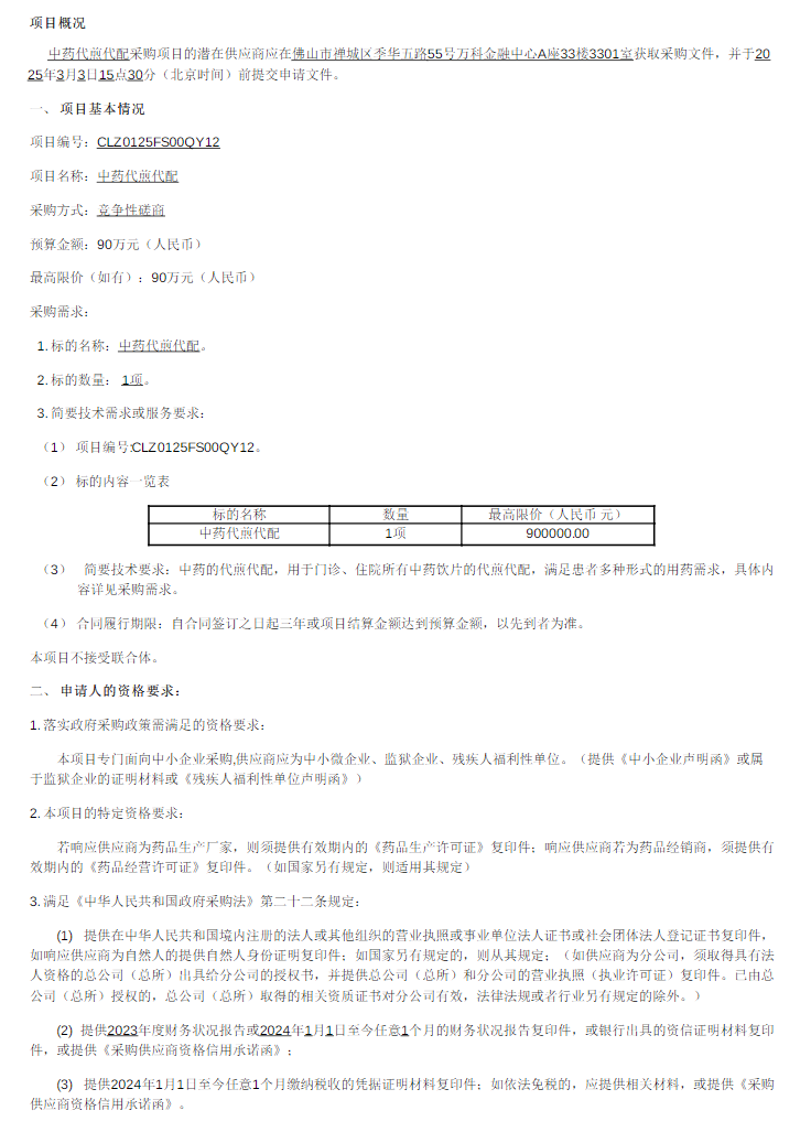 【佛山市南海区人民医院】广东省佛山市南海区人民医院中药代煎代配竞争性磋商公告