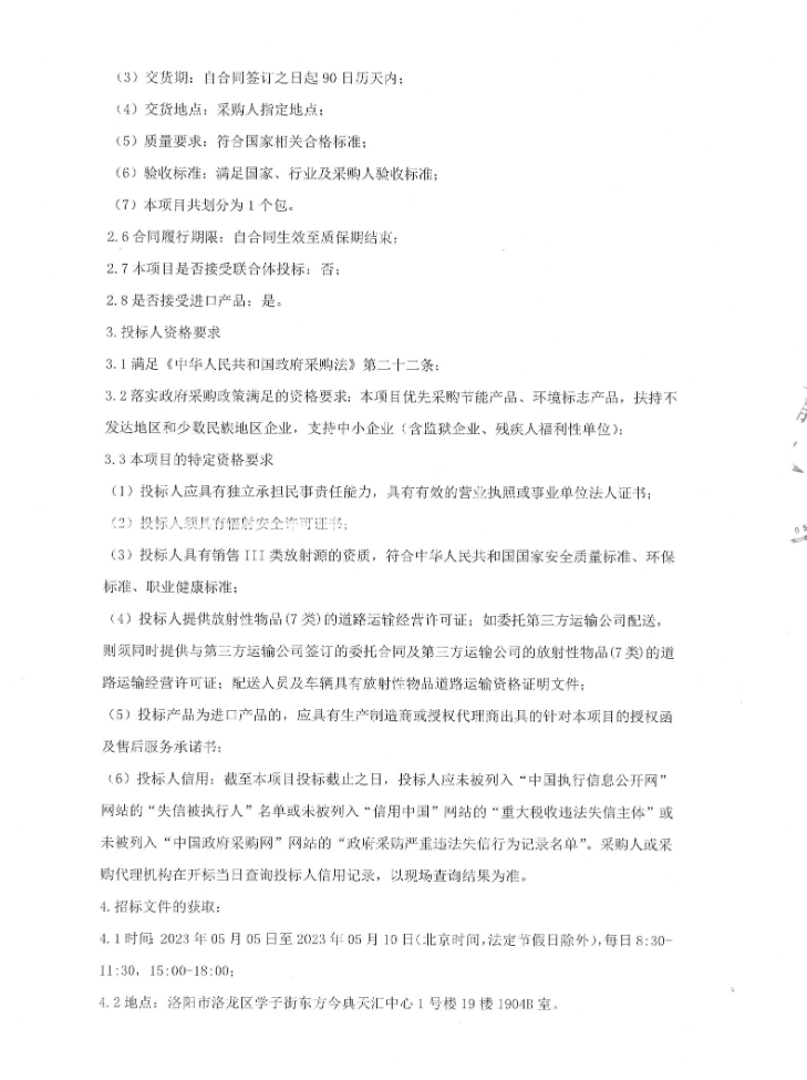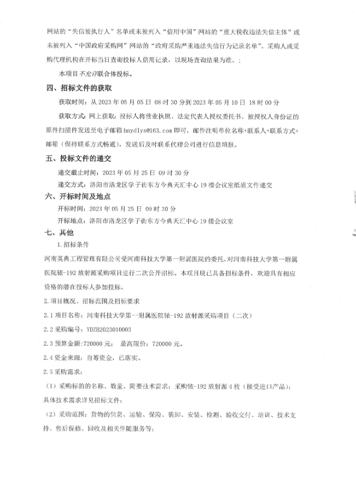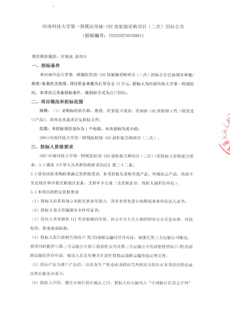 【河南科技大学第一附属医院】河南科技大学第一附属医院铱-192放射源采购项目(二次)招标公告