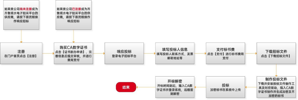 如果本标在 齐鲁观水电子招采平台 操作,请登录电子招标投标平台并 使用CA数字证书 加密制作投标文件,操作流程见下方说明。