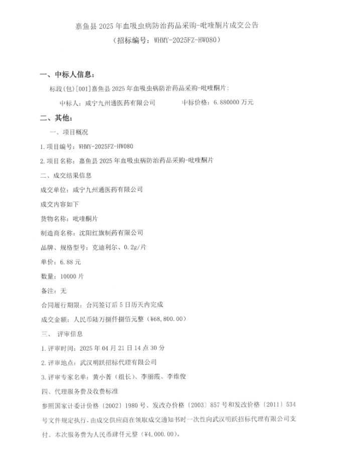【咸宁市嘉鱼县卫生健康局】湖北省咸宁市嘉鱼县2025年血吸虫病防治药品采购-吡喹酮片成交公告