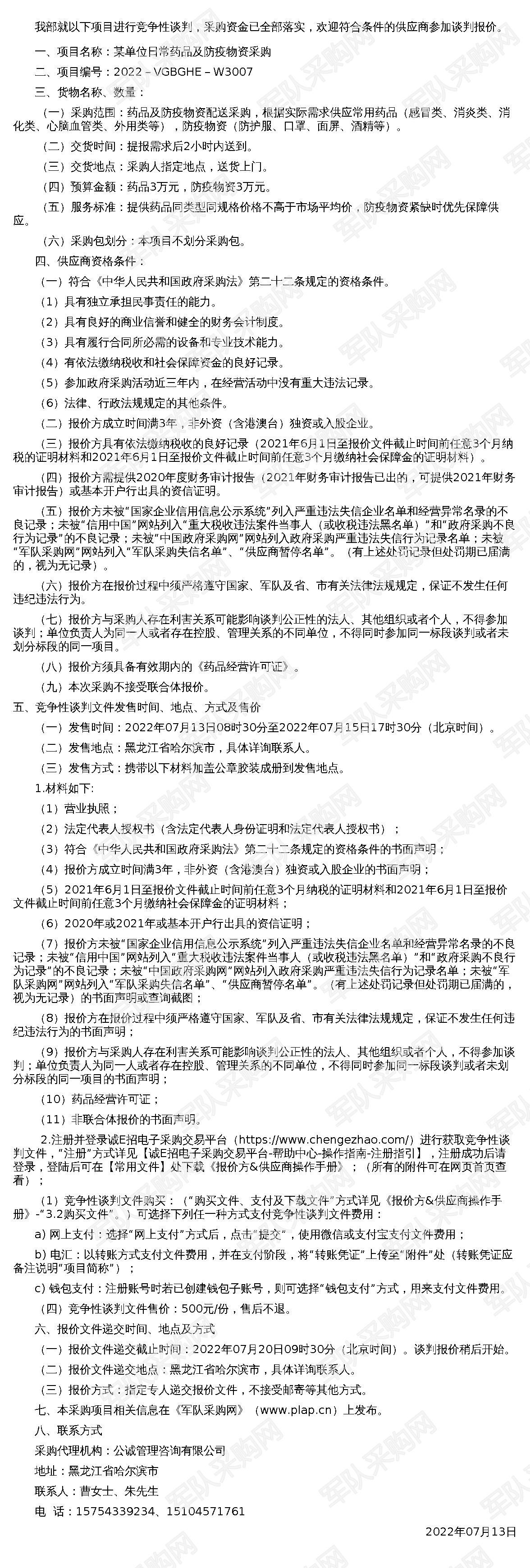 【军队采购】某单位日常药品及防疫物资采购(2022-VGBGHE-W3007)