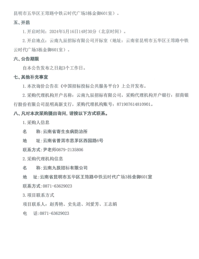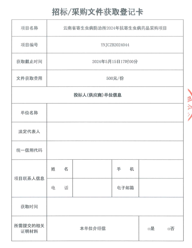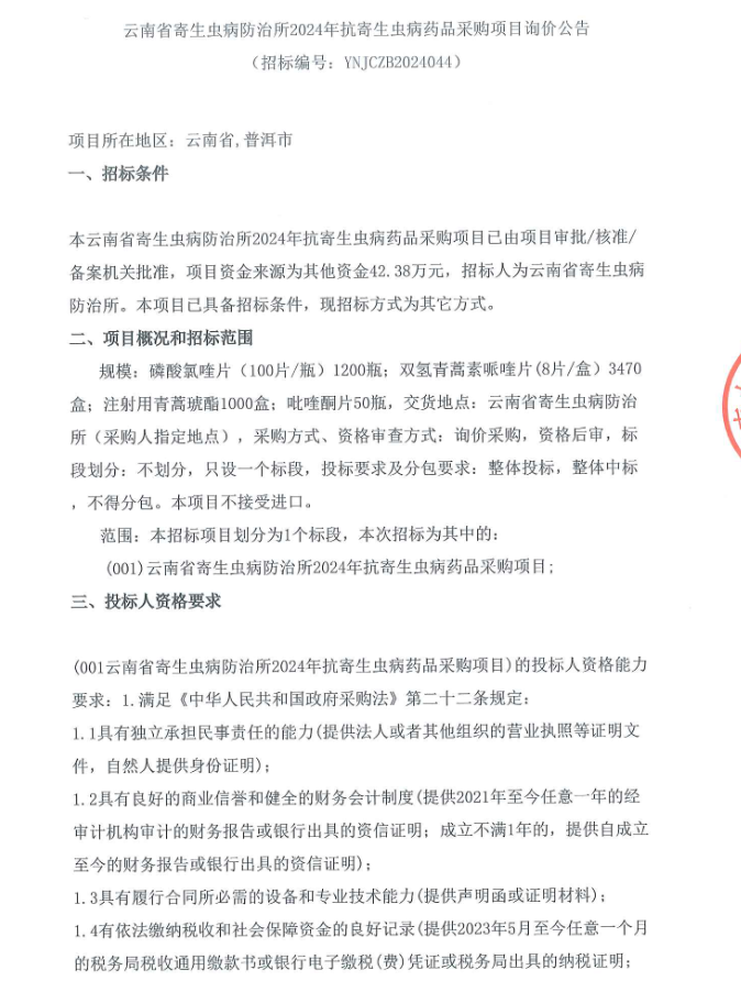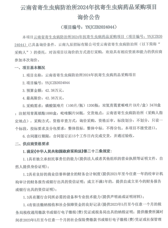 【云南省寄生虫病防治所】云南省寄生虫病防治所2024年抗寄生虫病药品采购项目询价公告