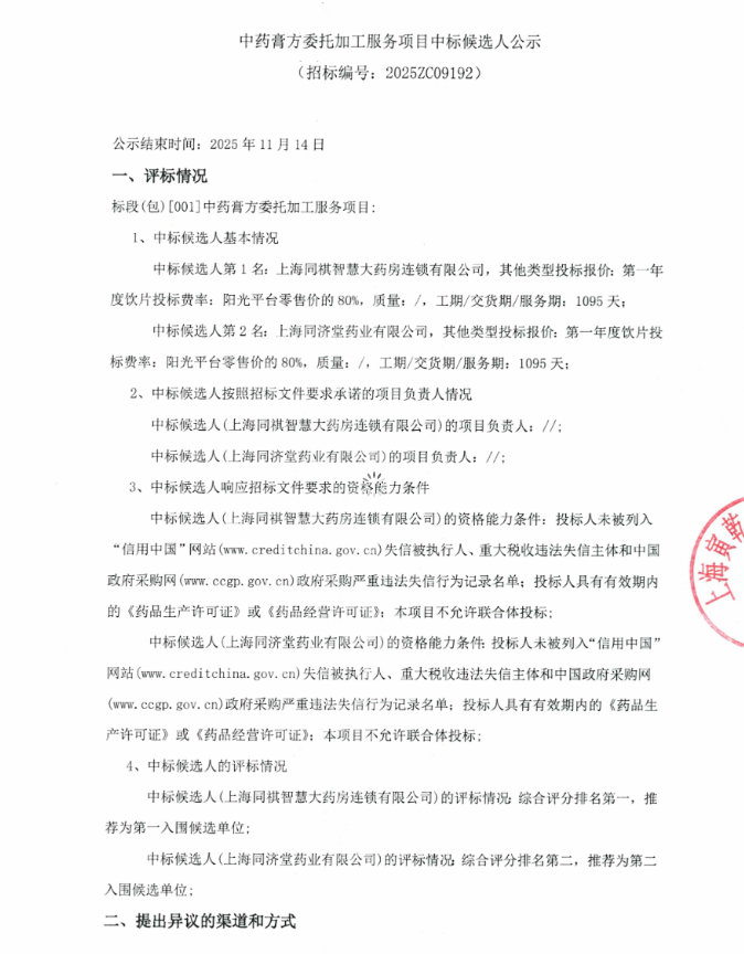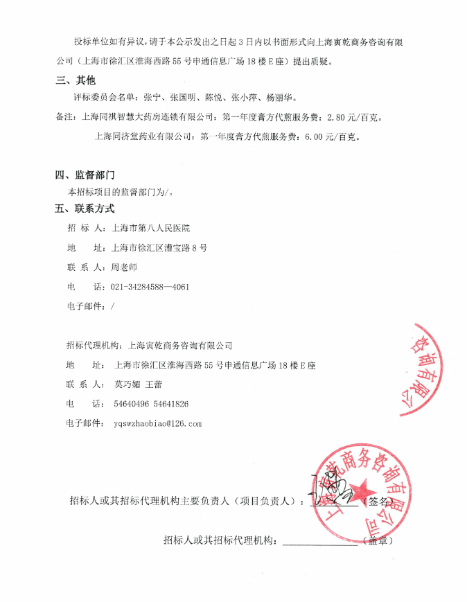 【上海市第八人民医院】上海市第八人民医院中药膏方委托加工服务项目中标候选人公示