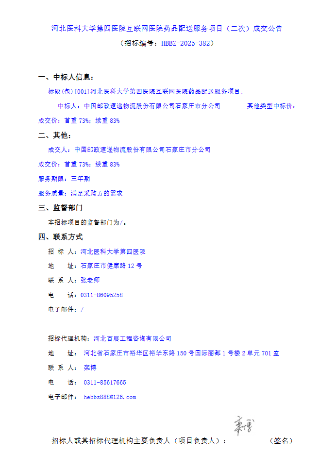 【河北医科大学第四医院】河北医科大学第四医院互联网医院药品配送服务项目(二次)成交公告