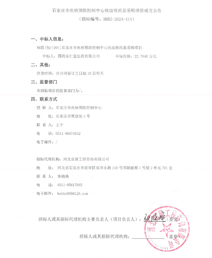 【石家庄市疾病预防控制中心】河北省石家庄市疾病预防控制中心抗结核药品采购项目成交公告
