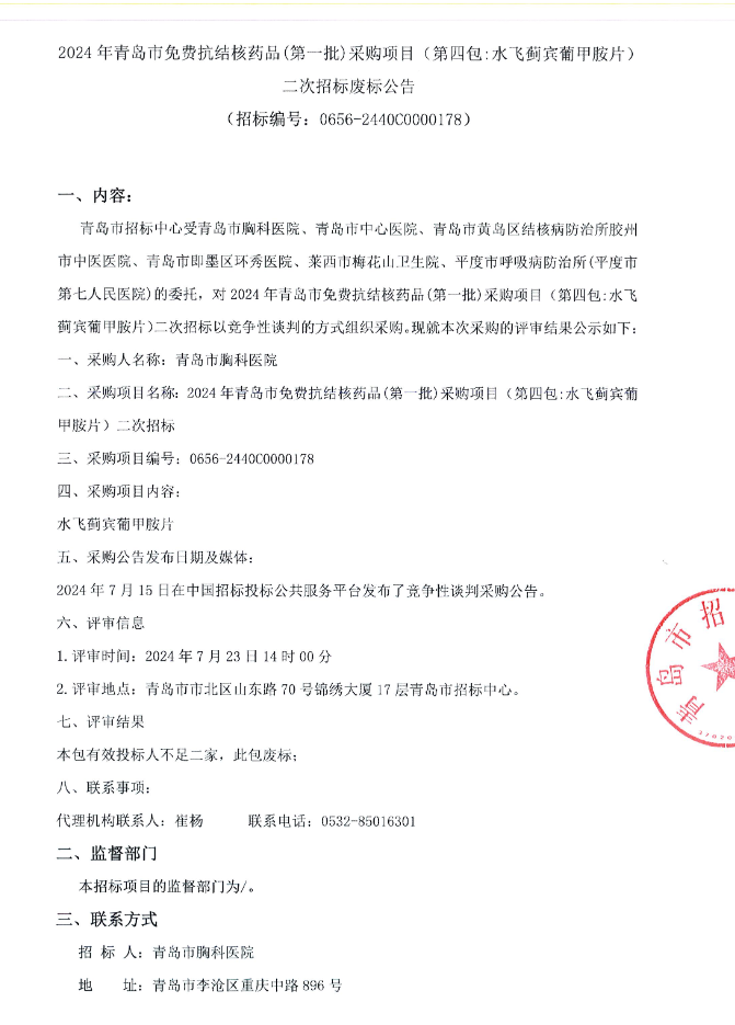 【青岛市胸科医院】山东省2024年青岛市免费抗结核药品(第一批)采购项目(第四包:水飞蓟宾葡甲胺片)二次招标废标公告