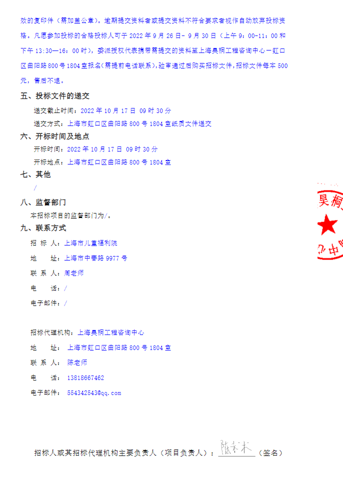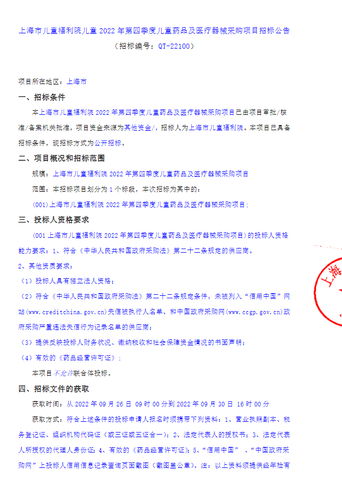 【上海市儿童福利院】儿童2022年第四季度儿童药品及医疗器械采购项目招标公告(QT-22100)