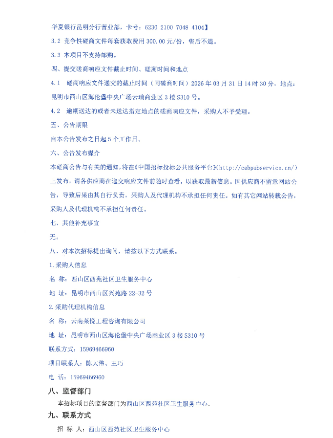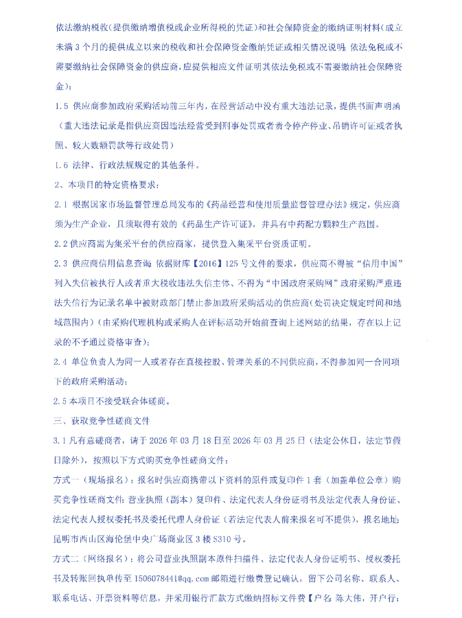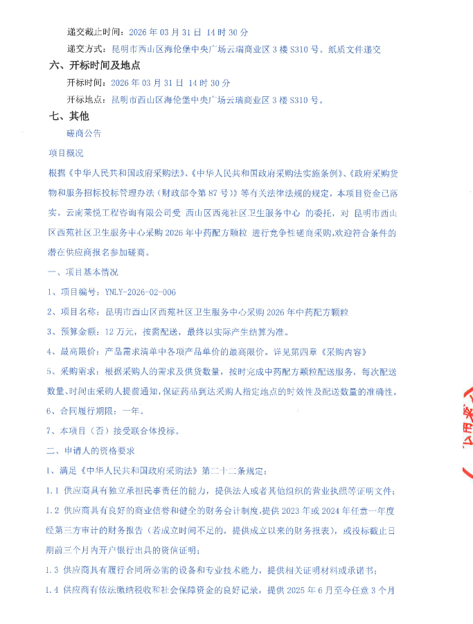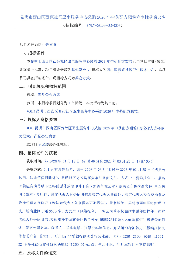 【昆明市西山区西苑社区卫生服务中心】云南省昆明市西山区西苑社区卫生服务中心采购2026年中药配方颗粒竞争性磋商公告