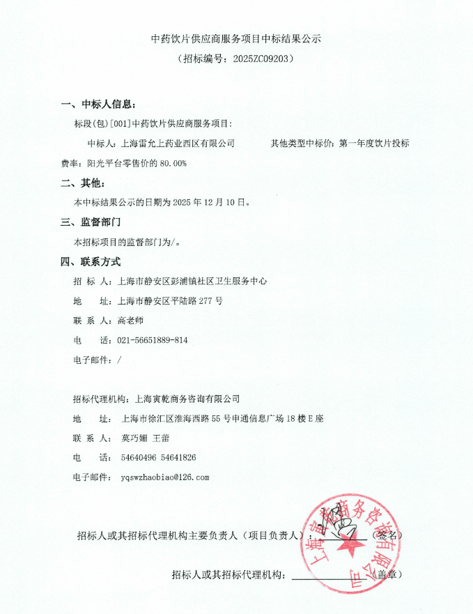 【上海市静安区彭浦镇社区卫生服务中心】上海市静安区彭浦镇社区卫生服务中心中药饮片供应商服务项目中标结果公示