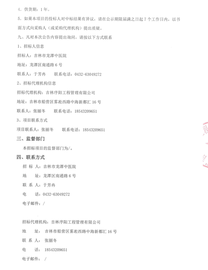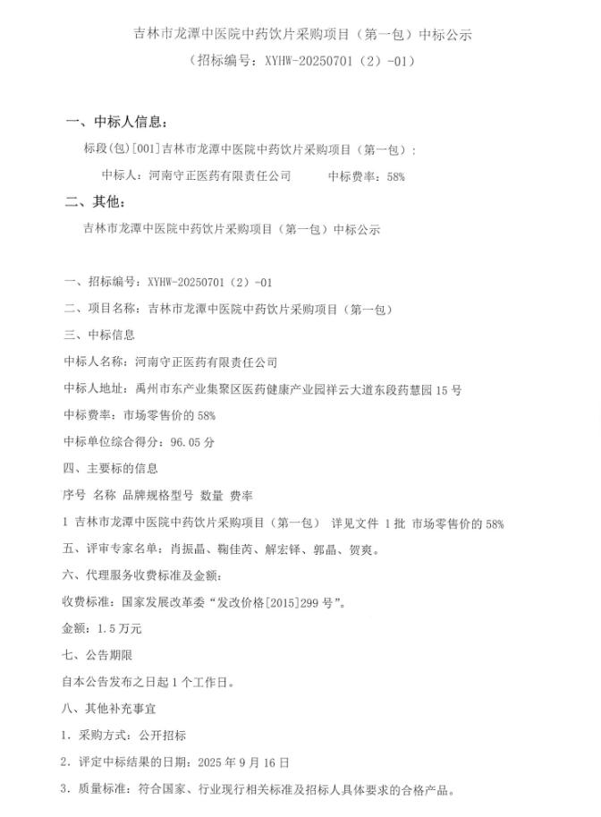 【吉林市龙潭中医院】吉林省吉林市龙潭中医院中药饮片采购项目(第一包)中标公示