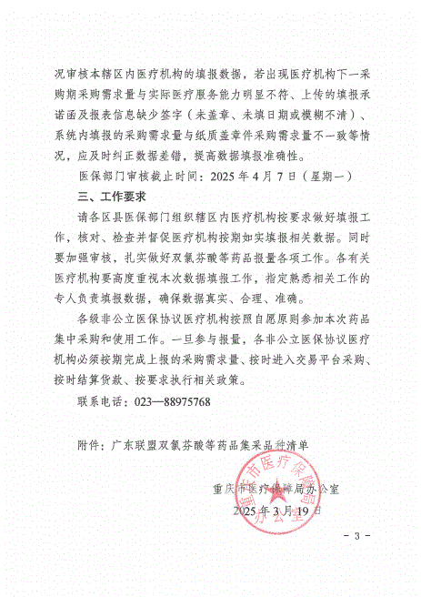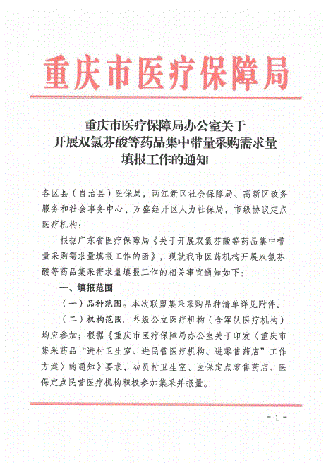 【重庆】重庆市医疗保障局办公室关于开展双氯芬酸等药品集中带量采购需求量填报工作的通知