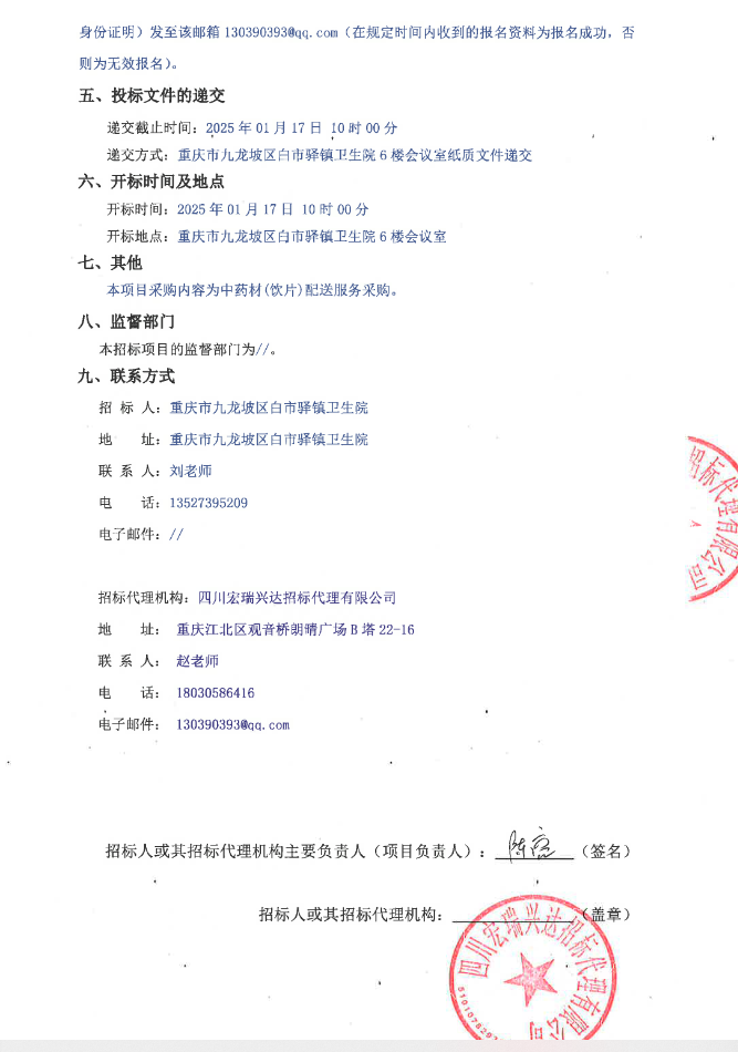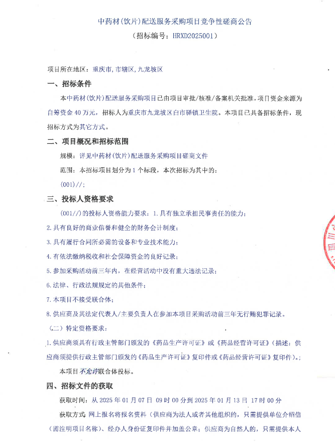 【重庆市九龙坡区白市驿镇卫生院】重庆市九龙坡区白市驿镇卫生院中药材(饮片)配送服务采购项目竞争性磋商公告