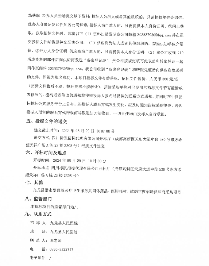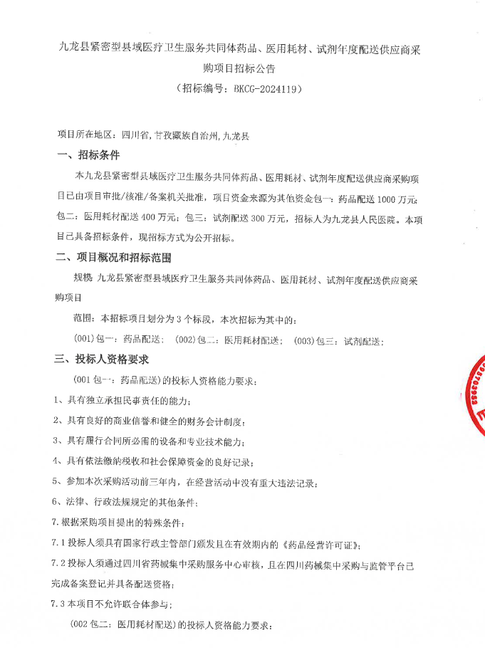【甘孜藏族自治州九龙县人民医院】四川省甘孜藏族自治州九龙县紧密型县域医疗卫生服务共同体药品、医用耗材、试剂年度配送供应商采购项目招标公告