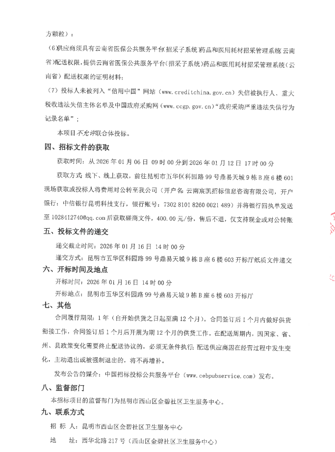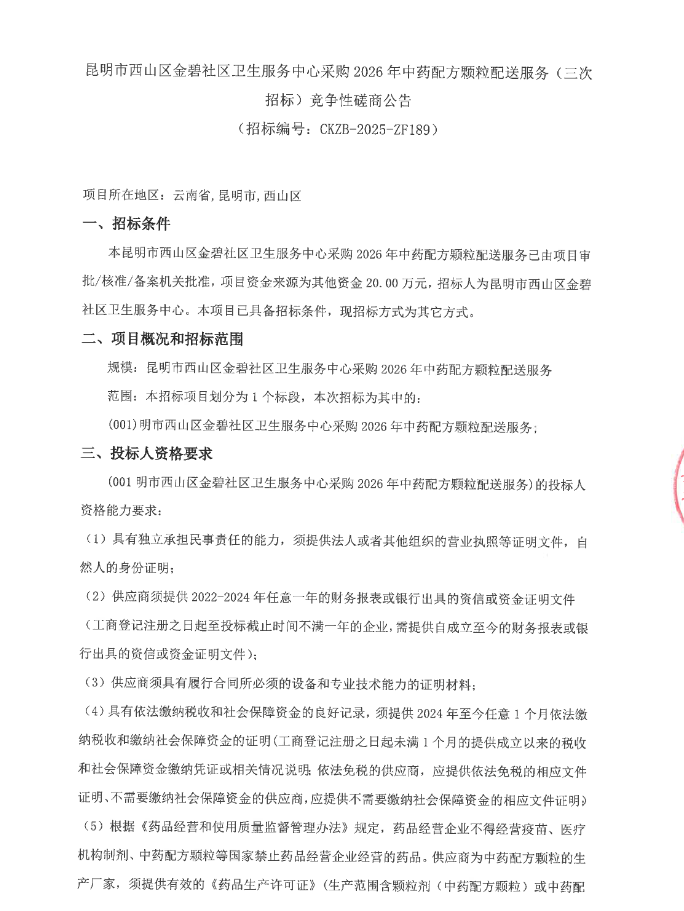 【昆明市西山区金碧社区卫生服务中心】云南省昆明市西山区金碧社区卫生服务中心采购2026年中药配方颗粒配送服务(三次招标)竞争性磋商公告