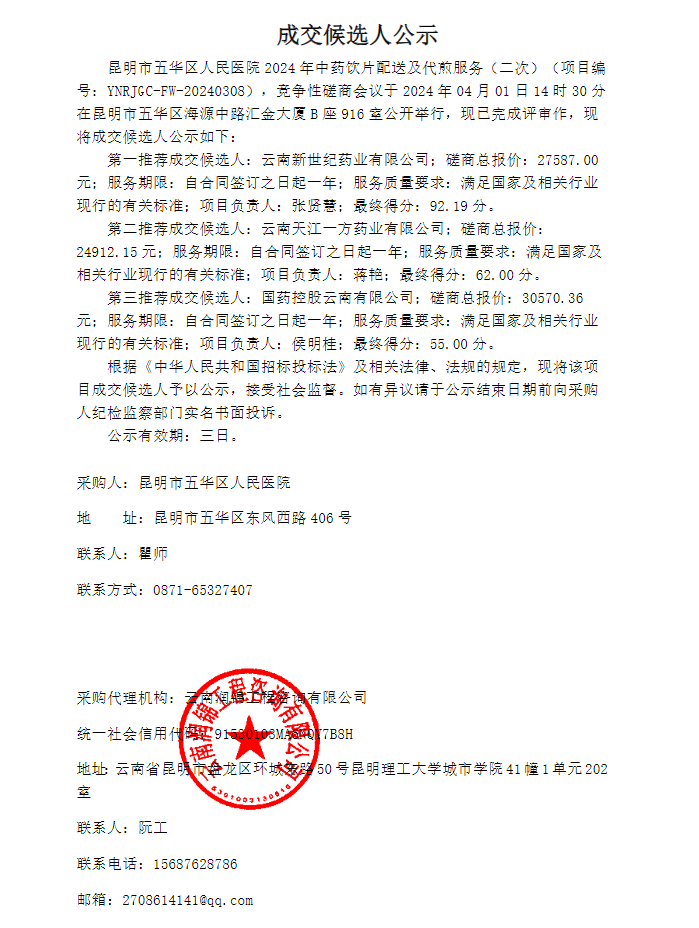 【昆明市五华区人民医院】云南省昆明市五华区人民医院2024年中药饮片配送及代煎服务 (二次)成交候选人公示