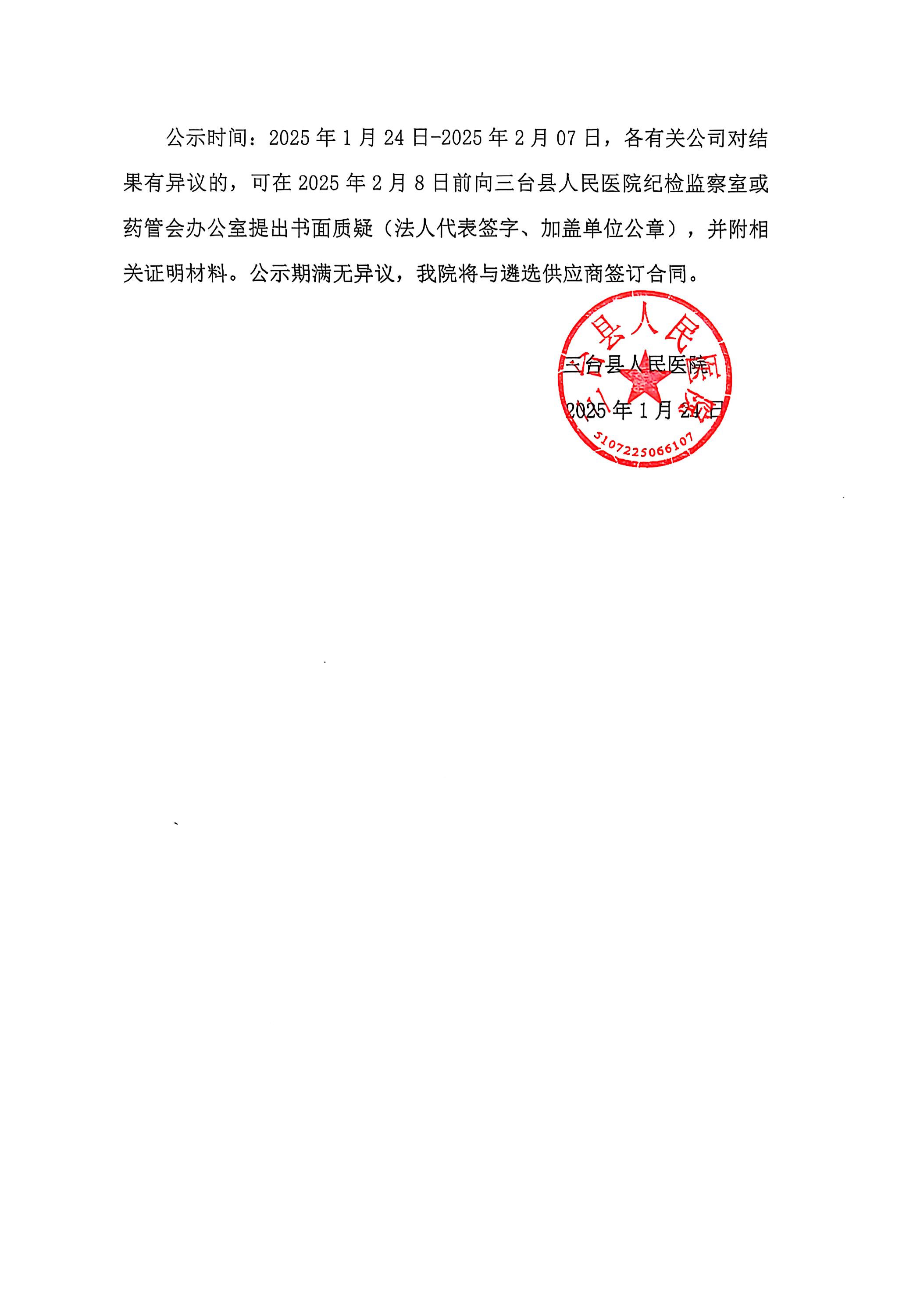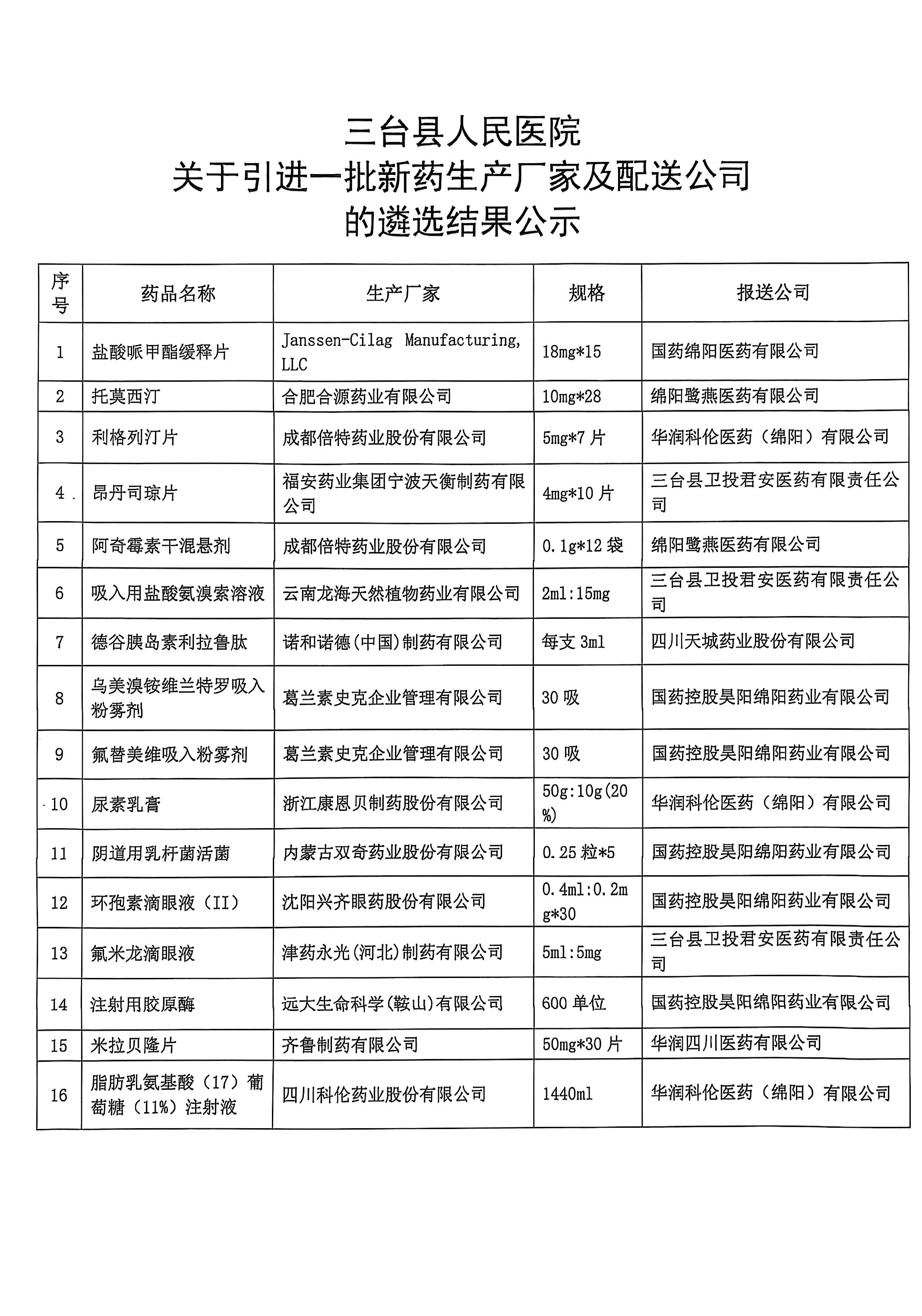 【绵阳市三台县人民医院】四川省绵阳市三台县人民医院关于引进一批新药生产厂家及配送公司遴选结果公示(20250127)