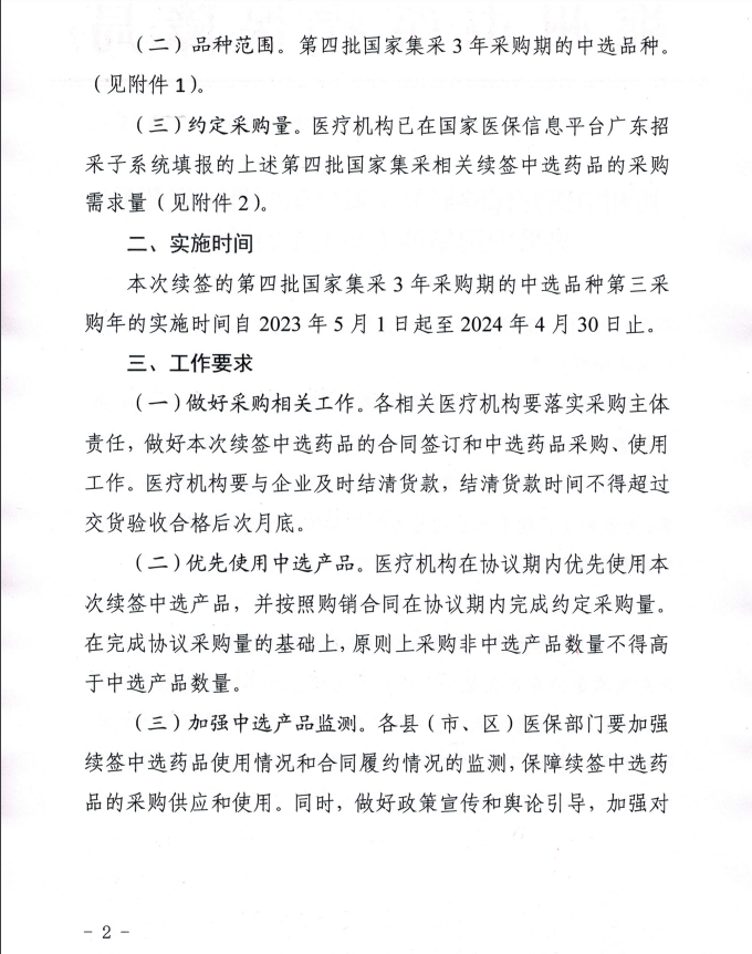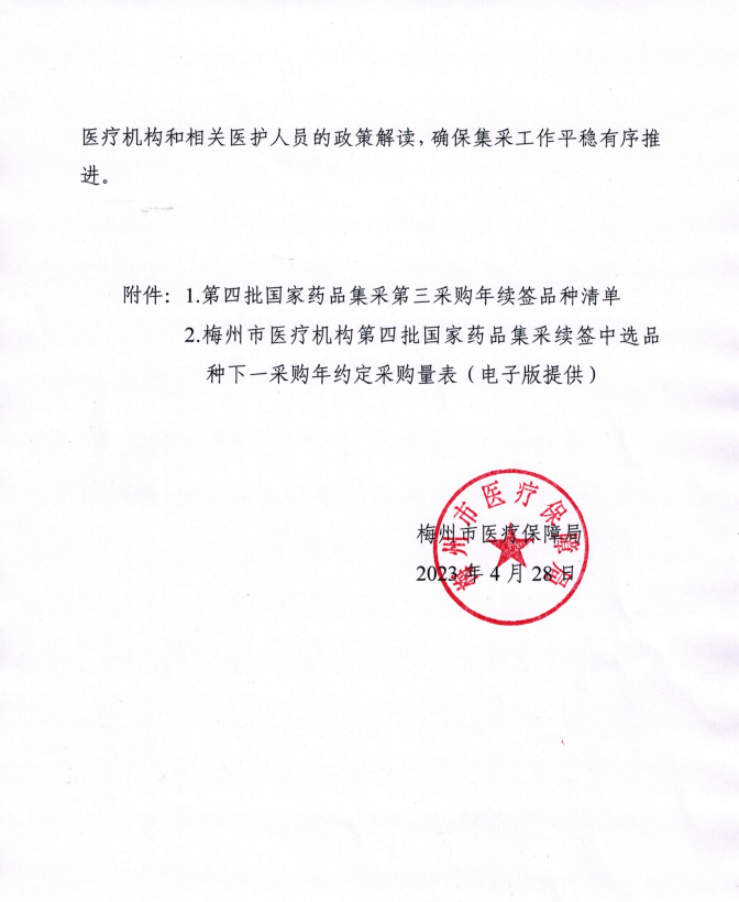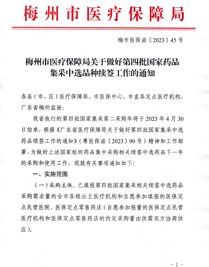 我省执行的第四批国家集采第二采购年将于2023年4月30 日结束,根据《广东省医疗保障局关于做好第四批国家集采中选药品续签工作的通知》(粤医保函〔2023〕90号)精神和工作部署,为做好上述国家组织药品集中采购相关续签中选药品下一年的采购和使用工作,现就有关事项通知如下: