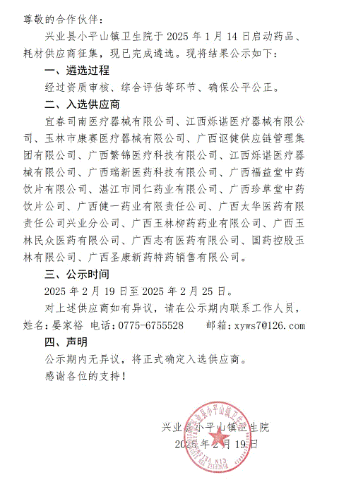 【玉林市兴业县小平山镇卫生院】广西壮族自治区玉林市兴业县小平山镇卫生院关于2025年度医用耗材及药品采购企业(供应商)遴选结果公示