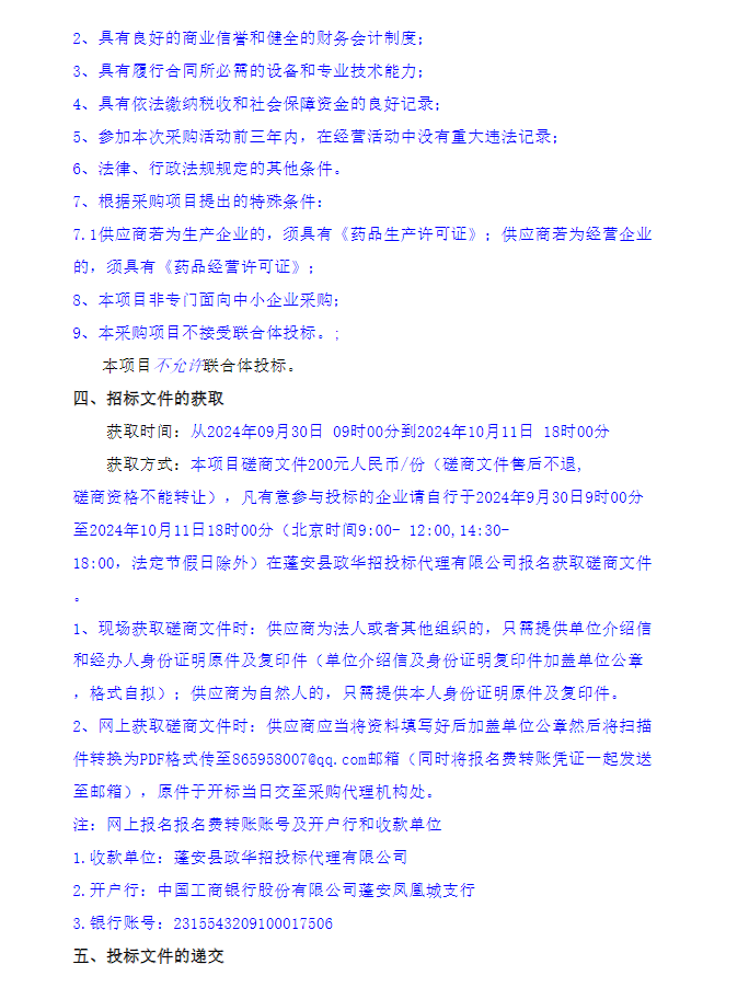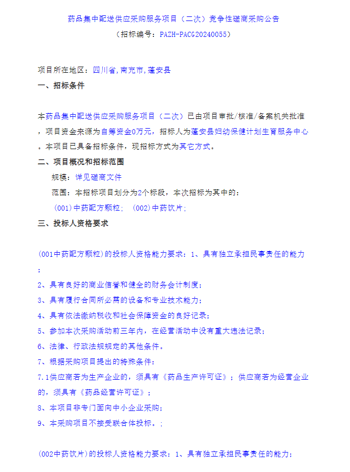 【南充市蓬安县妇幼保健计划生育服务中心】四川省南充市蓬安县妇幼保健计划生育服务中心药品集中配送供应采购服务项目(二次)竞争性磋商采购公告