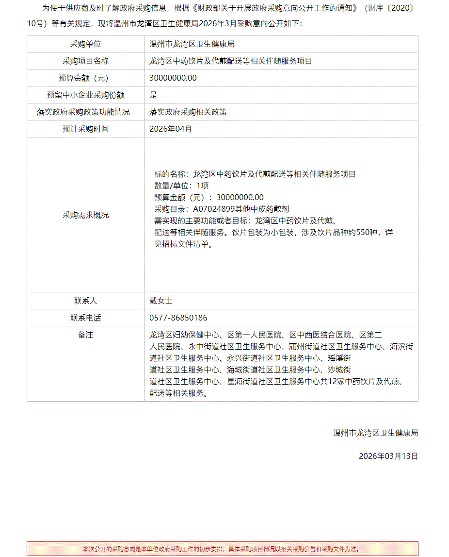 【温州市龙湾区卫生健康局】浙江省温州市龙湾区卫生健康局2026年3月政府采购意向