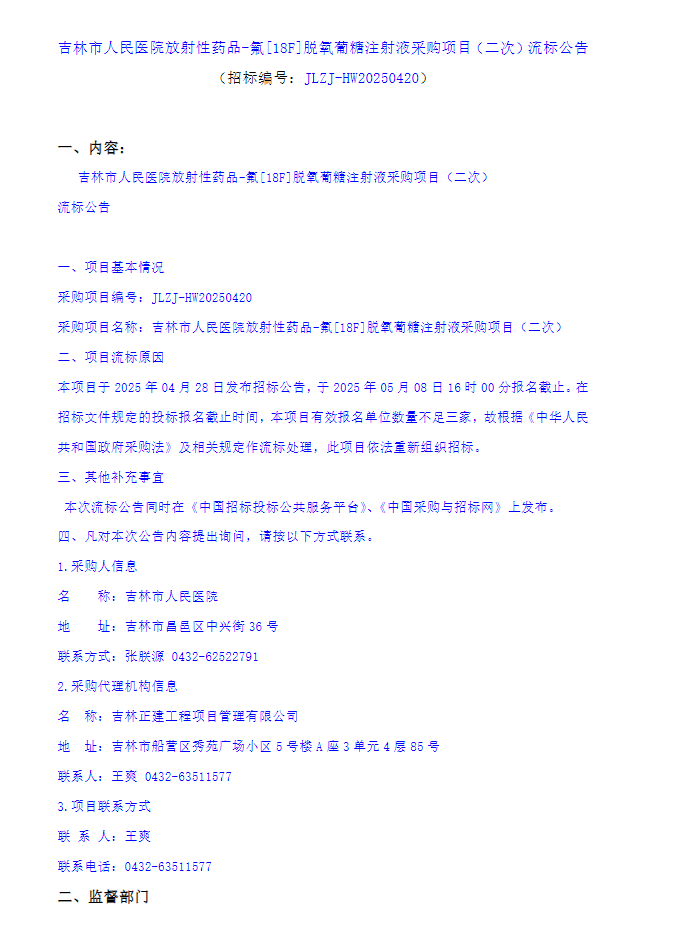 【吉林市人民医院】吉林省吉林市人民医院放射性药品-氟〔18F〕脱氧葡糖注射液采购项目(二次)流标公告
