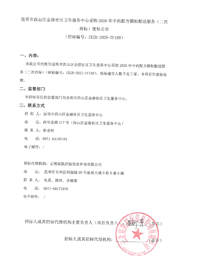 【昆明市西山区金碧社区卫生服务中心】云南省昆明市西山区金碧社区卫生服务中心采购2026年中药配方颗粒配送服务(二次招标)废标公告