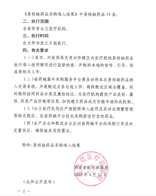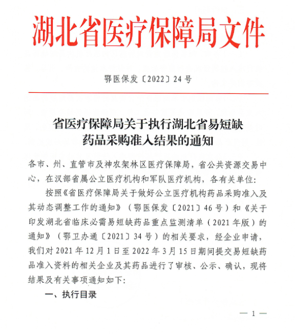 现将《省医疗保障局关于执行湖北省易短缺药品采购准入结果的通知》(鄂医保发〔2022〕24号)转发给你们,请遵照执行。
