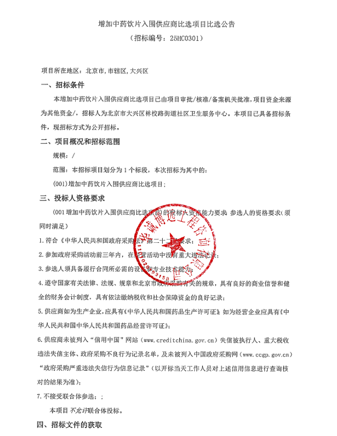 【北京市大兴区林校路街道社区卫生服务中心】北京市大兴区林校路街道社区卫生服务中心增加中药饮片入围供应商比选项目比选公告