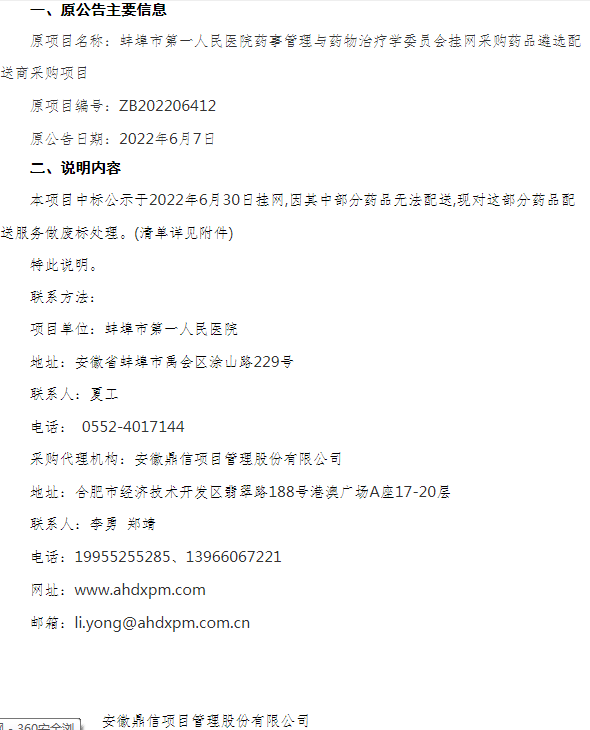 【蚌埠市第一人民医院】安徽蚌埠市第一人民医院药事管理与药物治疗学委员会挂网采购药品遴选配送商采购补充说明