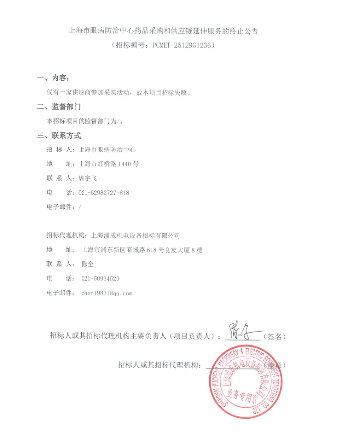【上海市眼病防治中心】上海市眼病防治中心药品采购和供应链延伸服务的终止公告