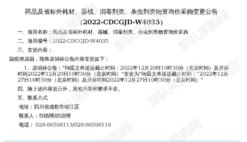 【军队采购】军队采购网药品及省标外耗材、器械、消毒剂类、杀虫剂类物资询价采购变更公告(2022-CDCGJD-W4035)