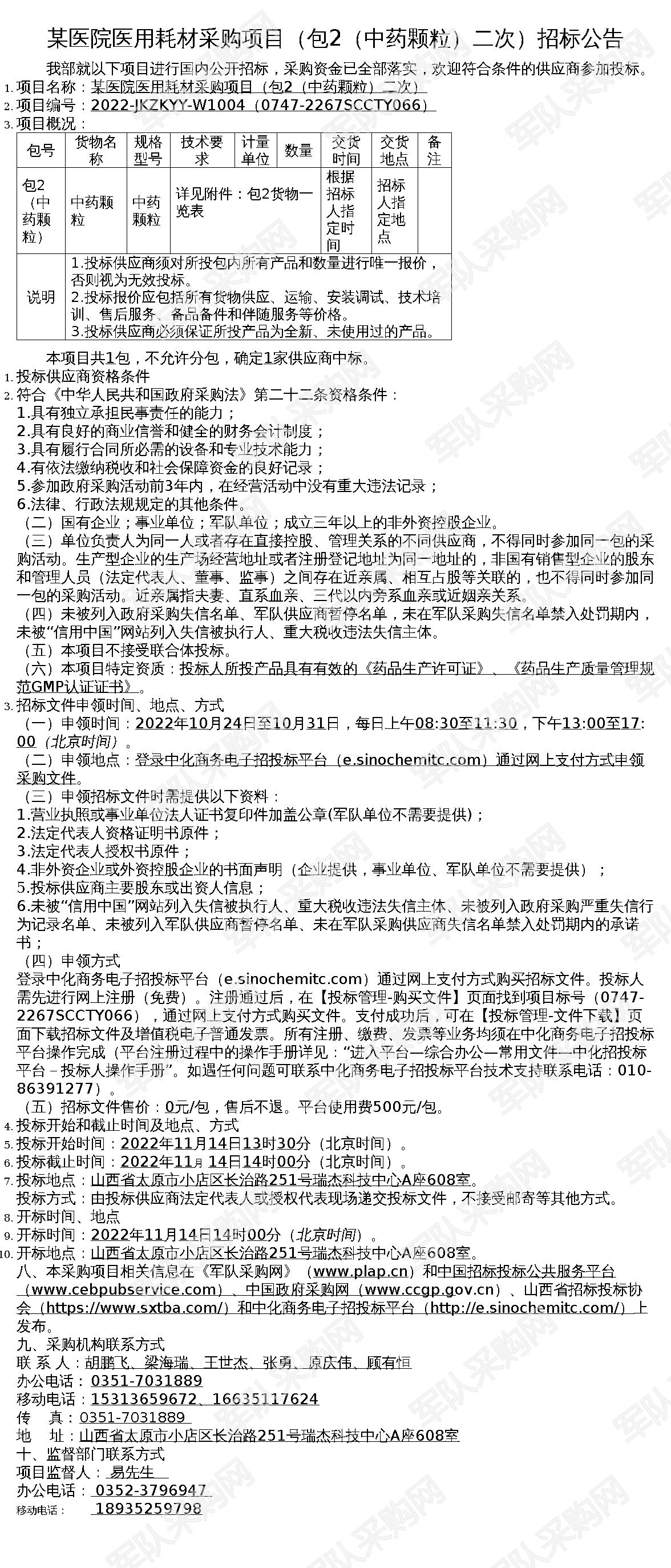 【军队采购网某医院】医用耗材采购项目(包2(中药颗粒)二次)招标公告2022-JKZKYY-W1004