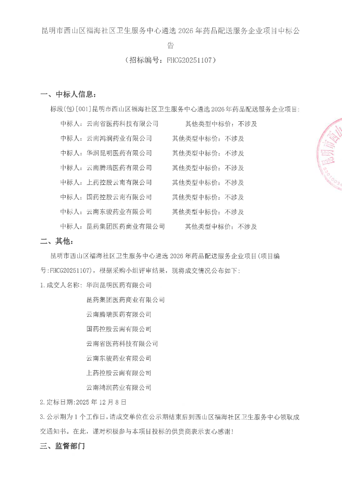 【昆明市西山区福海社区卫生服务中心】云南省昆明市西山区福海社区卫生服务中心遴选2026年药品配送服务企业项目中标公告