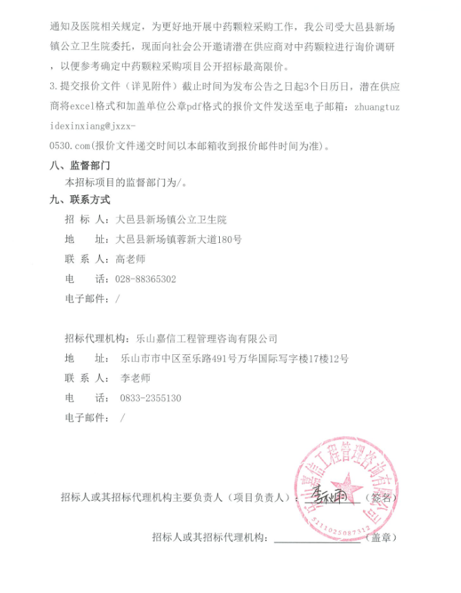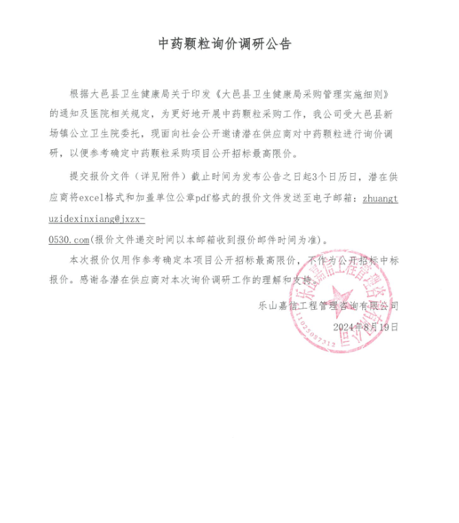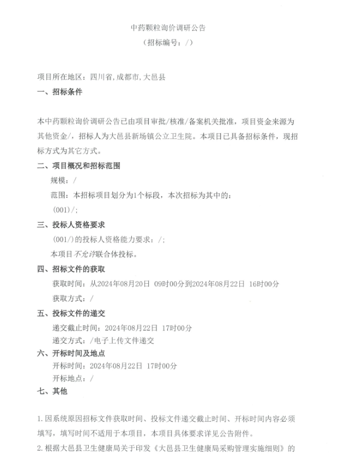 【成都市大邑县新场镇公立卫生院】四川省成都市大邑县新场镇公立卫生院中药颗粒询价调研公告