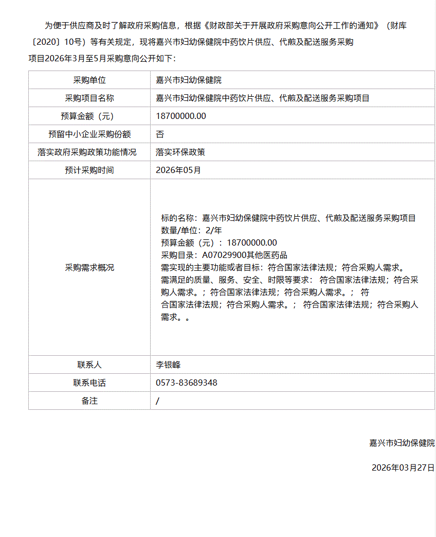 【嘉兴市妇幼保健院】浙江省嘉兴市妇幼保健院中药饮片供应、代煎及配送服务采购项目2026年3月至5月政府采购意向