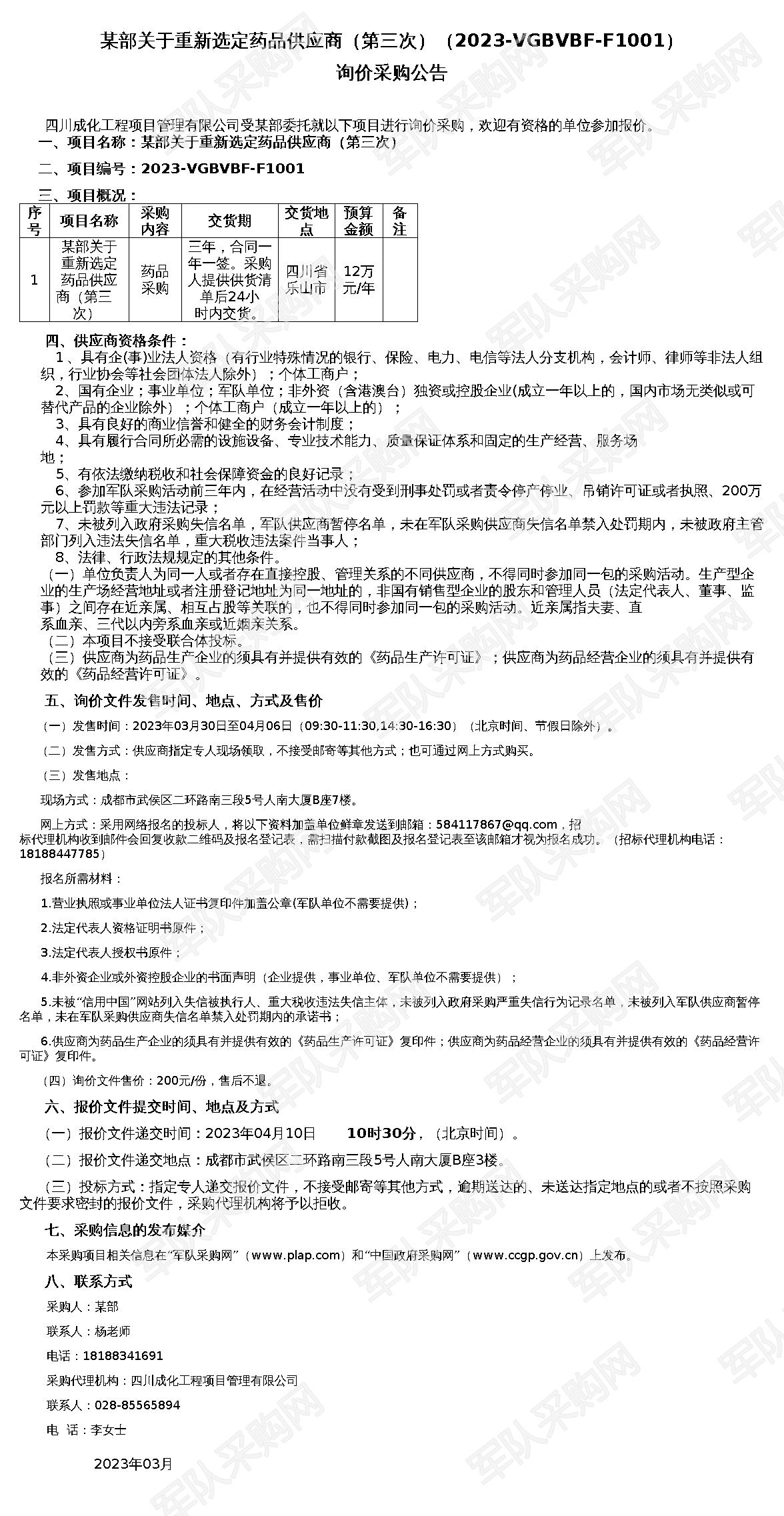 【军队采购】军队采购网某部关于重新选定药品供应商询价采购公告(第三次)(2023-VGBVBF-F1001)