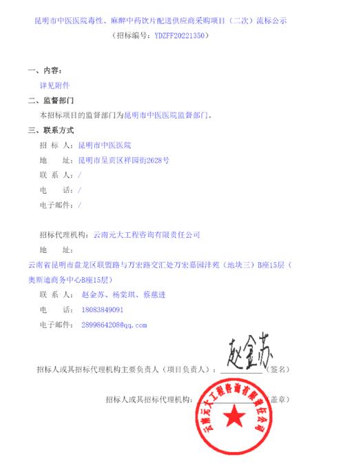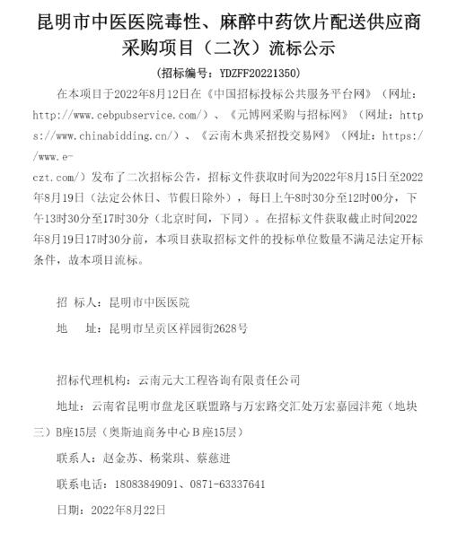 【昆明市中医医院】云南省昆明市中医医院毒性、麻醉中药饮片配送供应商采购项目(二次)流标公示