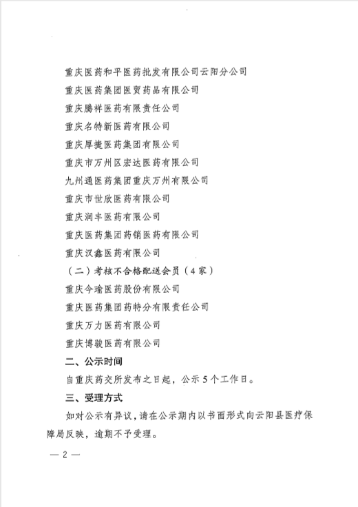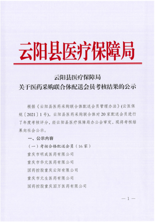 【重庆】重庆市云阳县医疗保障局关于医药采购联合体配送会员考核结果的公示