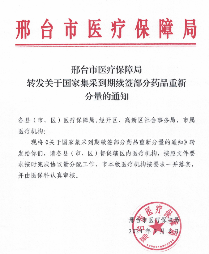 【邢台】邢台市医疗保障局转发关于国家集采到期续签部分药品重新分量的通知