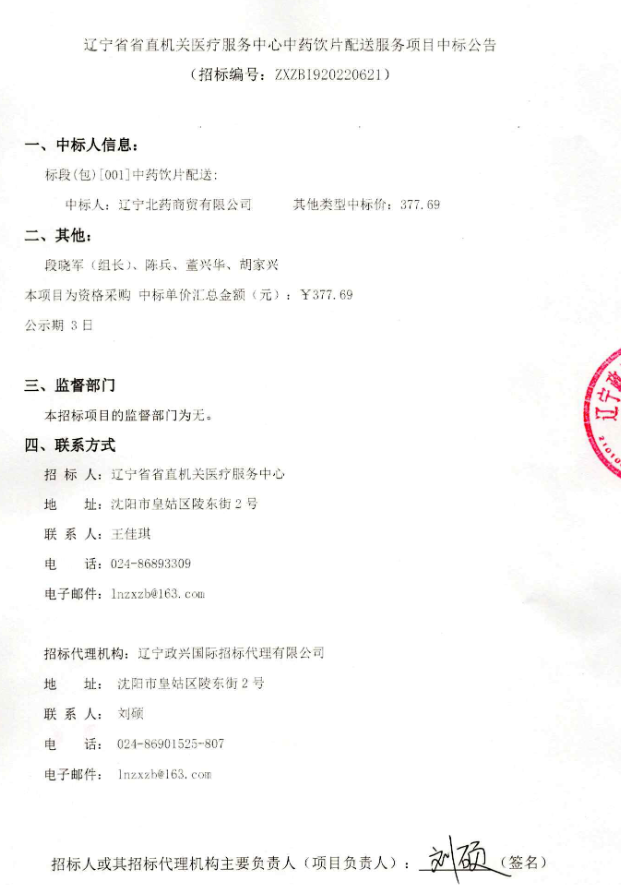 【辽宁省省直机关医疗服务中心】辽宁省省直机关医疗服务中心中药饮片配送服务中标公告