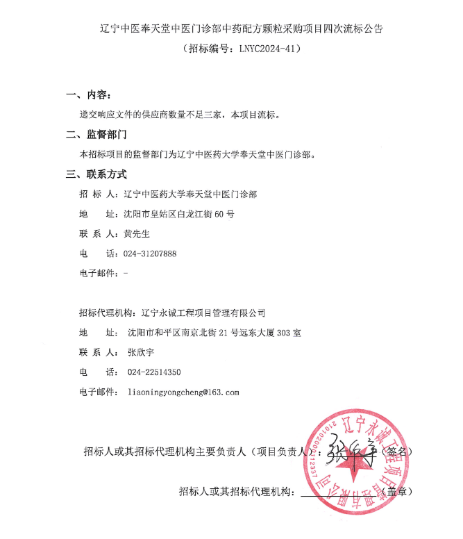 【辽宁中医奉天堂中医门诊部部】辽宁中医奉天堂中医门诊部中药配方颗粒采购项目四次流标公告