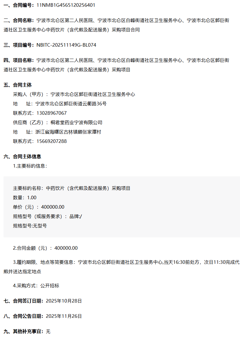 【宁波市北仑区第二人民医院】宁波市北仑区第二人民医院、宁波市北仑区白峰街道社区卫生服务中心、宁波市北仑区郭巨街道社区卫生服务中心中药饮片(含代煎及配送服务)采购项目合同公告