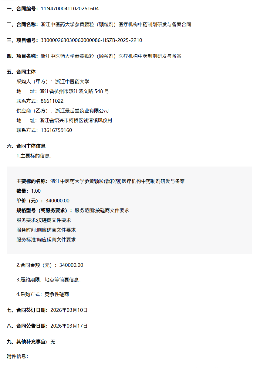 【浙江中医药大学】浙江中医药大学参黄颗粒(颗粒剂)医疗机构中药制剂研发与备案合同公告